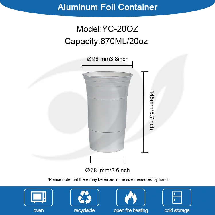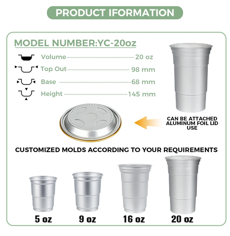 YUNCHU একটি চীন মানের 20oz নিষ্পত্তিযোগ্য সহজ অ্যালুমিনিয়াম পানীয় কাপ প্রস্তুতকারক। এটি একটি মাল্টি-ফাংশনাল 20oz ডিসপোজেবল অ্যালুমিনিয়াম কাপ সিম্পল অ্যালুমিনিয়াম ড্রিংকিং কাপ যা খাদ্য-গ্রেড অ্যালুমিনিয়াম ফয়েল দিয়ে তৈরি। এটি হালকা ওজন, স্থায়িত্ব এবং 100% পুনর্ব্যবহারযোগ্যতা বৈশিষ্ট্যযুক্ত। এর চমৎকার তাপ পরিবাহিতা এটিকে ঠান্ডা এবং গরম উভয় পানীয়ের জন্য উপযুক্ত করে তোলে। সিল করা ঢাকনা কার্যকরভাবে ফুটো প্রতিরোধ করতে পারে। এই কাস্টমাইজযোগ্য 20oz ডিসপোজেবল অ্যালুমিনিয়াম ড্রিংক কাপটি বিভিন্ন পরিস্থিতিতে যেমন কফি টেকআউট, আউটডোর ক্যাম্পিং এবং পার্টি ইভেন্টগুলির জন্য উপযুক্ত এবং রঙ, লোগো এবং ছাঁচের জন্য কাস্টমাইজেশন পরিষেবা সরবরাহ করে।