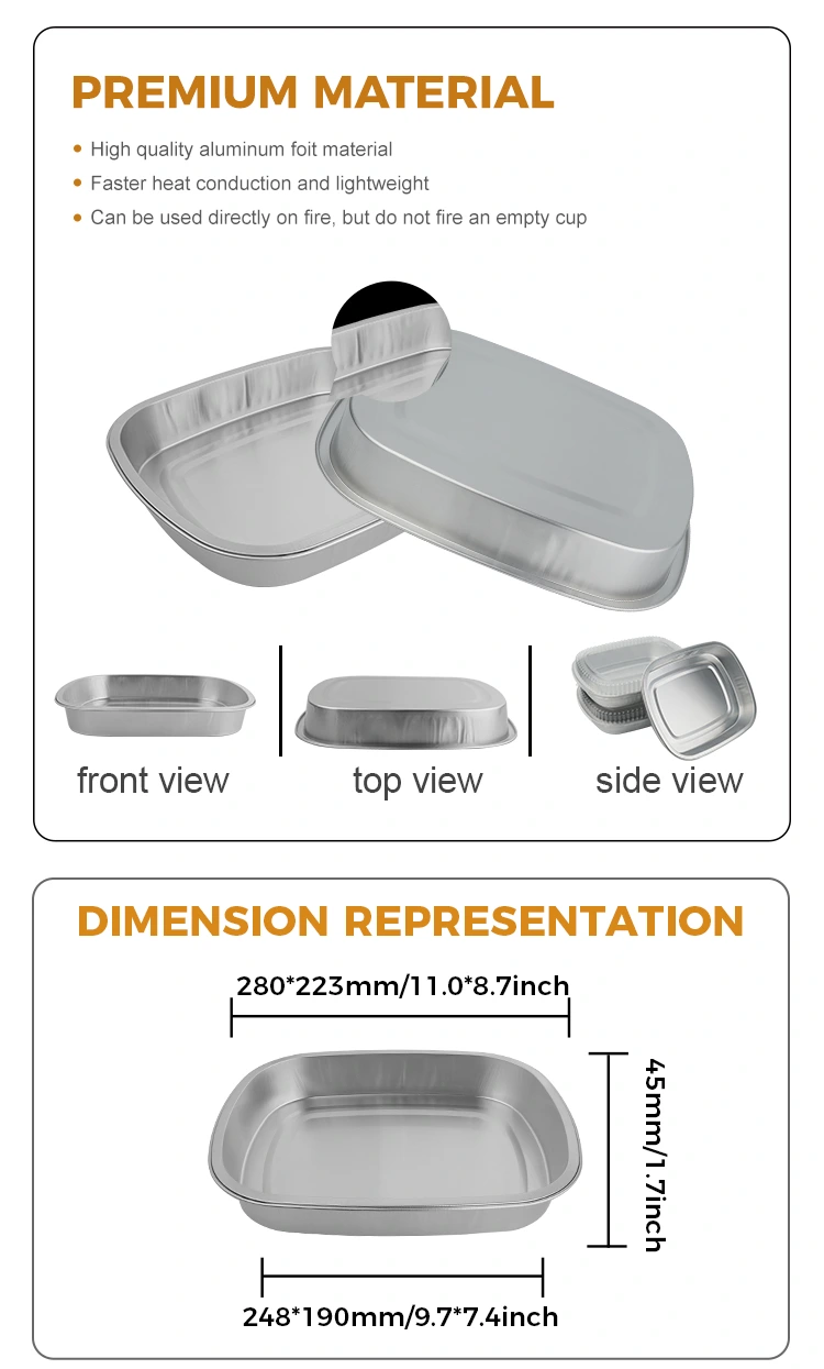 4. টেকওয়ে স্কয়ার স্লাইভার অ্যালুমিনিয়াম ফয়েল ফুড প্যানগুলি একটি আধুনিক রূপালী দীপ্তি দ্বারা পরিপূরক সহজ এবং ঝরঝরে লাইনগুলি গ্রহণ করে৷ এটি খাবারের ভিজ্যুয়াল আবেদন এবং সামগ্রিক গুণমানকে উন্নত করতে পারে, ব্র্যান্ডের পেশাদার এবং উচ্চমানের ইমেজকে শক্তিশালী করতে সহায়তা করে।