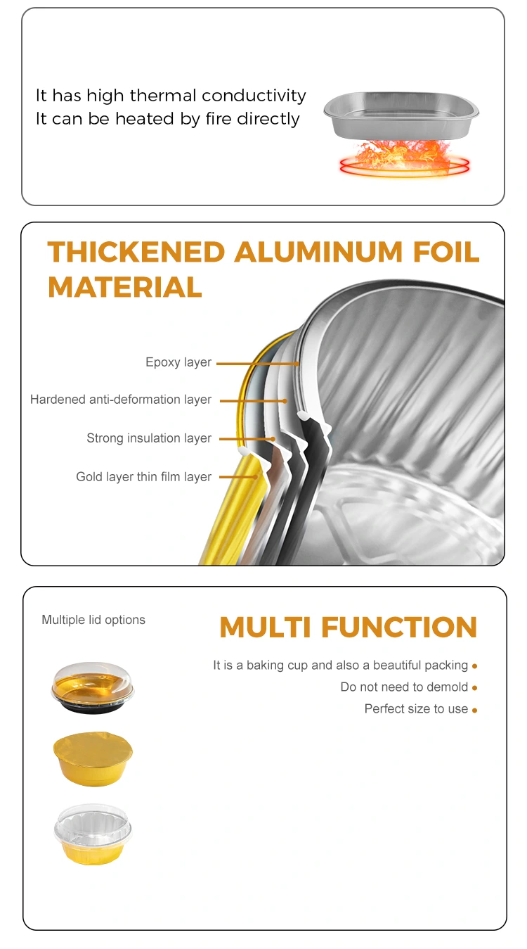 এটি ডিমের টার্ট, ব্রাউনি, কাপকেক, পিজ্জার একক স্লাইস বা ফ্লেকি পেস্ট্রির জন্য নিখুঁত প্যাকেজিং। অ্যালুমিনিয়াম ফয়েলের নিরোধক বৈশিষ্ট্য পেস্ট্রি বেক করার পরেই তাদের উষ্ণতা এবং নরম টেক্সচার বজায় রাখতে সহায়তা করে; এটি পুরোপুরি স্বাদ বজায় রাখে এবং বেকারি এবং ক্যাফে থেকে টেকআউটের জন্য উপযুক্ত।