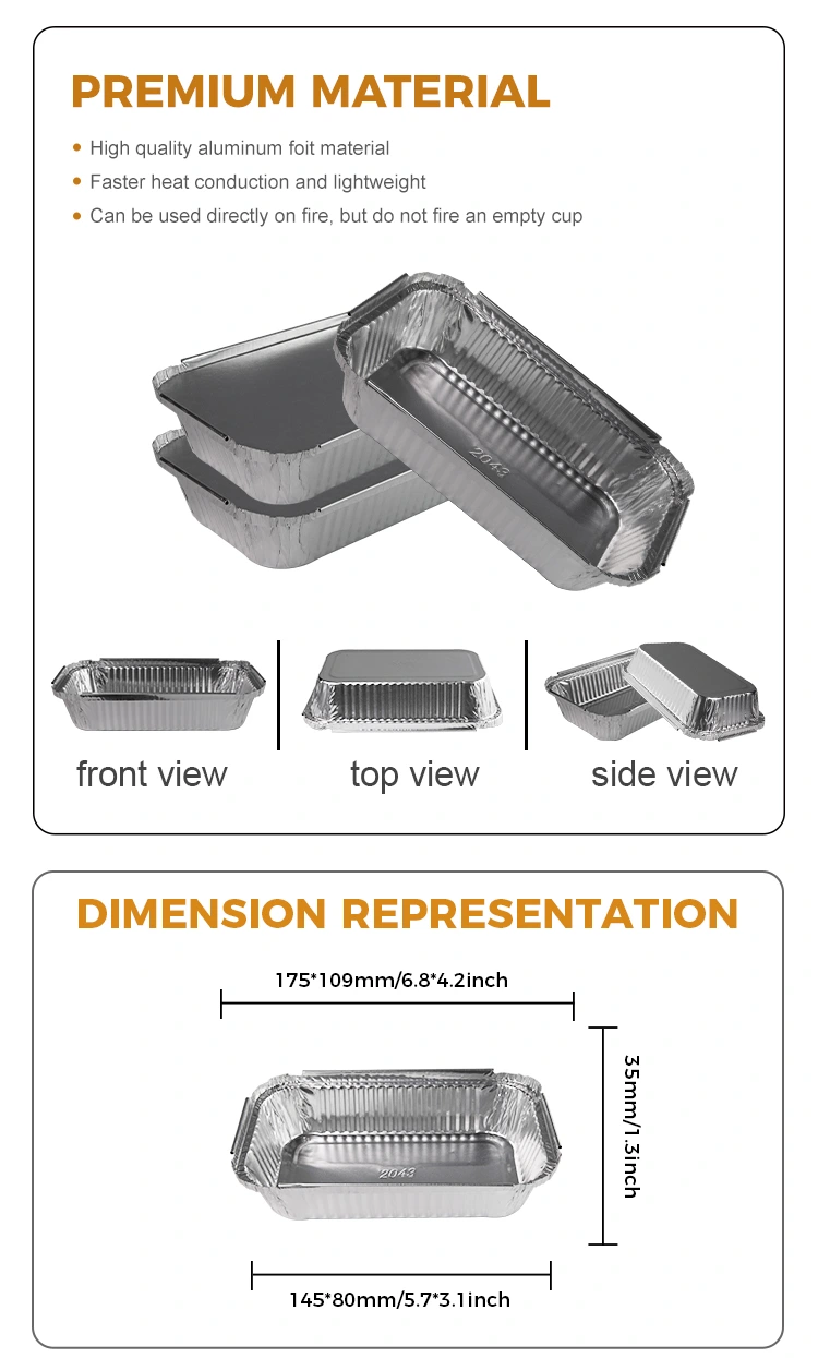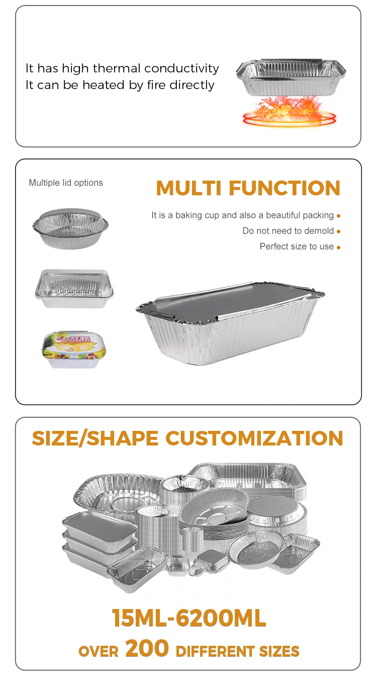এই ডিসপোজেবল ফাস্ট ফুড বক্স বারবিকিউ সিলভার অ্যালুমিনিয়াম ফয়েল কনটেইনারগুলি উচ্চ-মানের 8011 অ্যালুমিনিয়াম ফয়েল উপাদান দিয়ে তৈরি, যা একটি ভাল তাপ সংরক্ষণের প্রভাব রয়েছে এবং এটি খাদ্যটির তাপমাত্রা বজায় রাখতে পারে, এটি খাদ্যকে আরও সুস্বাদু এবং সুস্বাদু করে তোলে। এছাড়াও, আমাদের আয়তক্ষেত্রাকার বিবিকিউ সিলভার অ্যালুমিনিয়াম ফয়েল কনটেইনারটিও একটি তাপ নিরোধক ফাংশন দিয়ে সজ্জিত, যা অ্যালুমিনিয়াম ফয়েল id াকনা বা পিইটি প্লাস্টিকের id াকনা দিয়ে যুক্ত করা যেতে পারে, যা কাস্টমাইজড লোগোর জন্য সুবিধাজনক এবং ব্র্যান্ডের চিত্রকে আরও বাড়িয়ে তোলে।