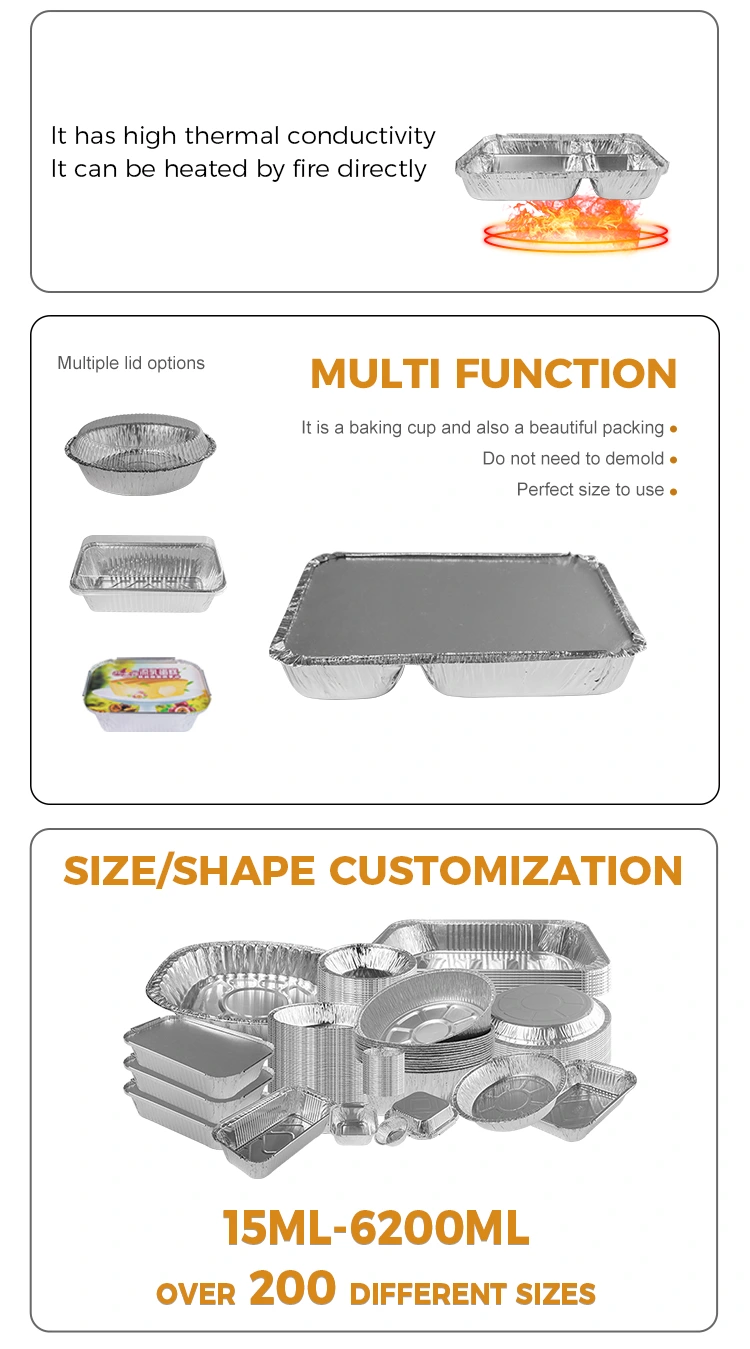 এই ফয়েল লাঞ্চ বাক্সে একটি মসৃণ পৃষ্ঠ রয়েছে যা এটি একটি পরিষ্কার এবং পরিষ্কার অনুভূতি দেয়। এর নিয়মিত আকারটি স্ট্যাকিং এবং প্লেসমেন্টের মতো বিভিন্ন প্যাকেজিং এবং পরিবহণের প্রয়োজনীয়তার সাথে খাপ খাইয়ে নেওয়া সহজ করে তোলে।