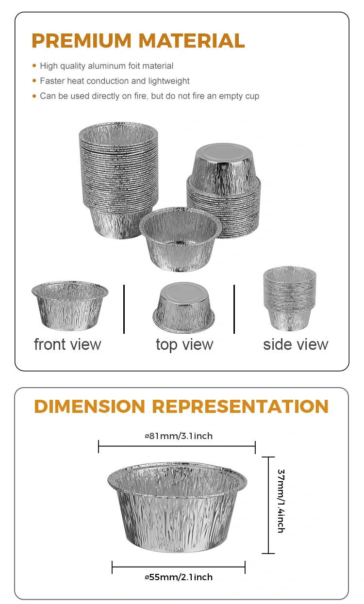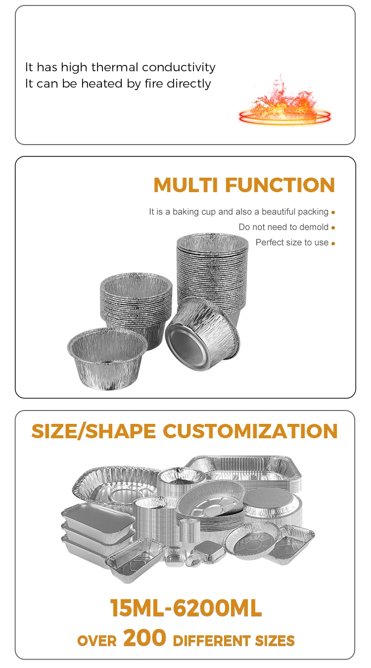 বৈশিষ্ট্য: স্বাস্থ্যকর এবং পরিবেশগতভাবে বন্ধুত্বপূর্ণ, পরিষ্কার করার প্রয়োজন নেই, বিভিন্ন গৃহস্থালী এবং বেকড খাবার তৈরির জন্য উপযুক্ত। এটি পরিবার এবং বেকারির জন্য সেরা পছন্দ। অ্যালুমিনিয়াম ফয়েল উপাদান নিরাপদ এবং স্বাস্থ্যকর, কোনও পরিষ্কারের প্রয়োজন নেই এবং এটি একটি খোলা শিখায় বেক করা যেতে পারে, এটি সুস্বাদু খাবার তৈরির জন্য সুবিধাজনক করে তোলে।