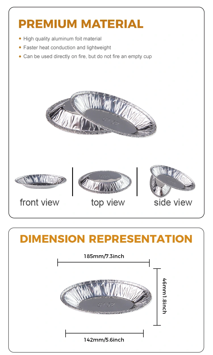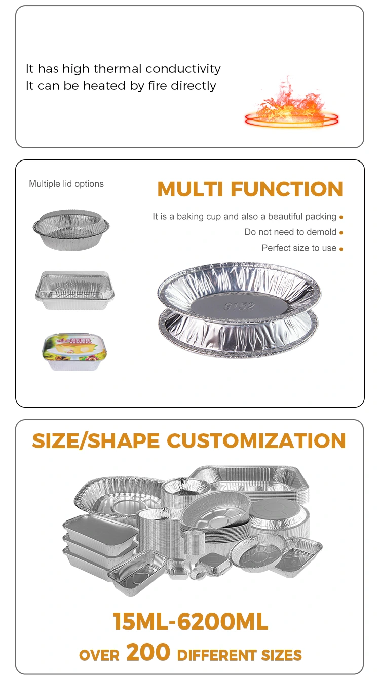 বৈশিষ্ট্যগুলি: এক-পিস ছাঁচনির্মাণ ঘন এবং বেকড-প্রতিরোধী, খাদ্য যোগাযোগের গ্রেড অ্যালুমিনিয়াম ফয়েল উপাদান গ্রহণ করে, খাবারের সাথে যোগাযোগ করার আশ্বাস দেয়, বিকৃত করা সহজ নয় এবং ফুটো নয়, দৃ strong ় বেধ, জারা প্রতিরোধের, উচ্চ তাপমাত্রা প্রতিরোধের।