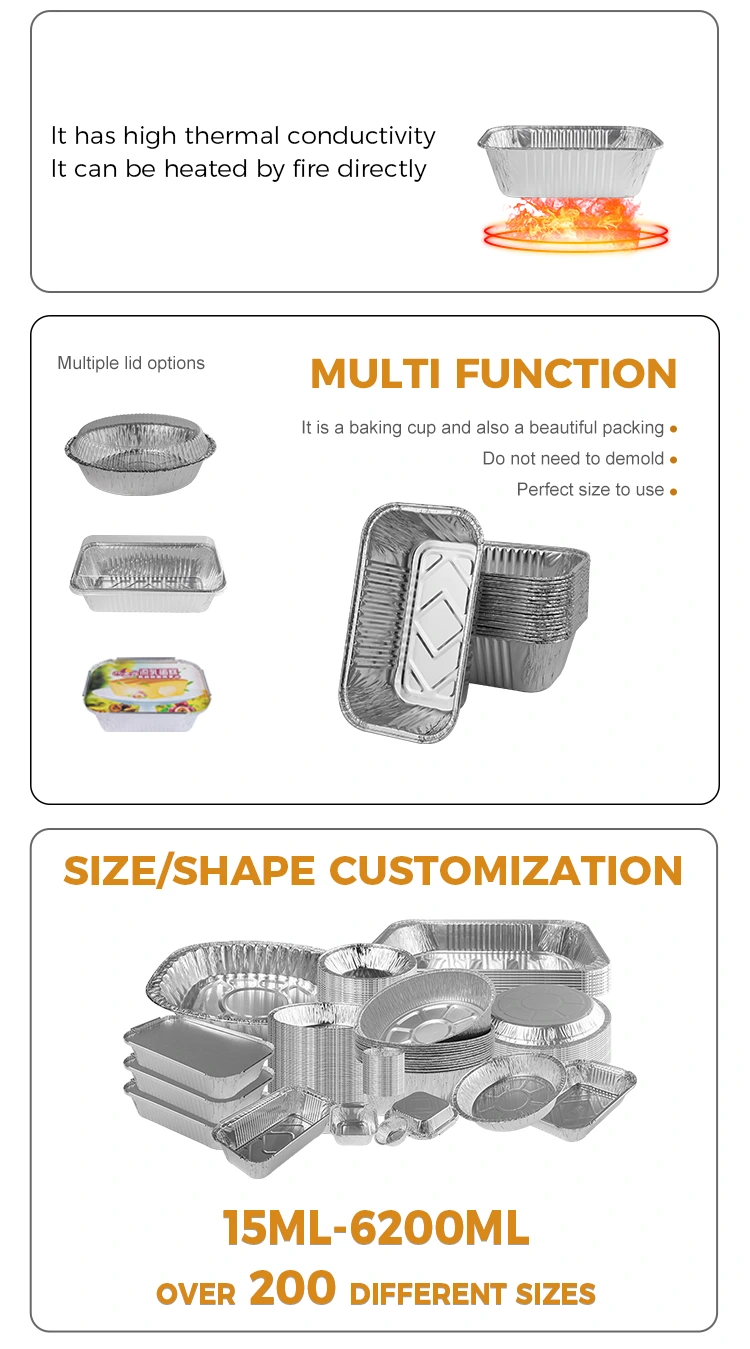 বৈশিষ্ট্যগুলি: পরিষ্কার না করে স্বাস্থ্যকর এবং পরিবেশ বান্ধব, বিভিন্ন পরিবার তৈরি করা, ছোট ছোট খাবারগুলি বেক করা, পরিবার এবং বেকারিগুলির পছন্দ, অ্যালুমিনিয়াম ফয়েল উপাদান নিরাপদ এবং স্বাস্থ্যকর, কোনও পরিষ্কার, কোনও খোলা শিখায় বেকড হতে পারে, খাবার তৈরির জন্য সুবিধাজনক।