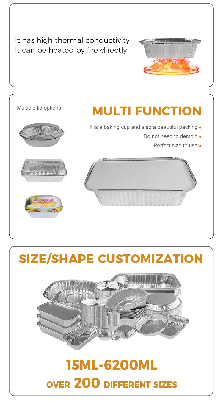 ইয়ুঞ্চু অ্যালুমিনিয়াম ফয়েল এই আয়তক্ষেত্রাকার এয়ার ফ্রায়ার প্যাকিং সিলভার অ্যালুমিনিয়াম ফয়েল ধারকগুলি উচ্চ মানের 8011 অ্যালুমিনিয়াম ফয়েল উপাদান দিয়ে তৈরি, যার দুর্দান্ত তাপ নিরোধক কর্মক্ষমতা রয়েছে এবং এটি কার্যকরভাবে খাবারের তাপমাত্রা বজায় রাখতে পারে, খাদ্যকে আরও সুস্বাদু এবং সুস্বাদু করে তোলে। একই সময়ে, আমাদের আয়তক্ষেত্রাকার বিবিকিউ সিলভার অ্যালুমিনিয়াম ফয়েল কনটেইনারটিও একটি তাপ সংরক্ষণ ফাংশন দিয়ে সজ্জিত, যা এটি অ্যালুমিনিয়াম ফয়েল id াকনা বা পিইটি প্লাস্টিকের id াকনাটির সাথে মিলে অর্জন করা যেতে পারে, যা কাস্টমাইজড লোগোর জন্য সুবিধাজনক এবং এইভাবে ব্র্যান্ডের চিত্রকে বাড়িয়ে তোলে।