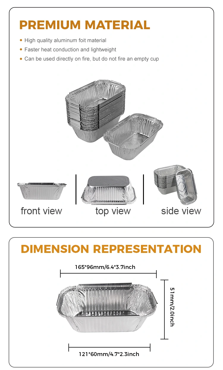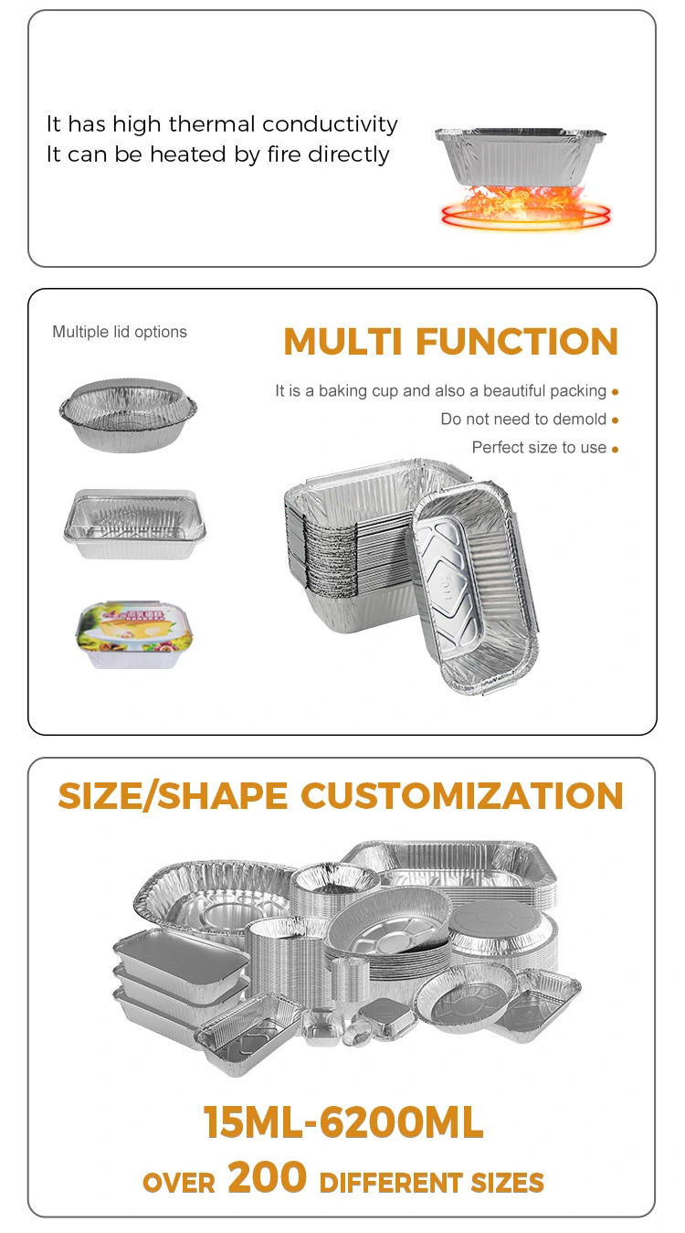 বৈশিষ্ট্যগুলি: আমরা সরবরাহ করি অ্যালুমিনিয়াম ফয়েল লাঞ্চ বক্সটি 8011 অ্যালুমিনিয়াম ফয়েল উপাদান দিয়ে তৈরি, যার তাপ সংরক্ষণের দুর্দান্ত পারফরম্যান্স রয়েছে এবং এটি কার্যকরভাবে খাবারের তাপমাত্রা বজায় রাখতে পারে, যা আপনার খাদ্যকে আরও আকর্ষণীয় করে তোলে। বিশেষত, আমাদের আয়তক্ষেত্রাকার বেকড ভাত রৌপ্য অ্যালুমিনিয়াম ফয়েল পাত্রে কেবল তাপ নিরোধক বৈশিষ্ট্যই নয়, তবে লোগোগুলির ব্যক্তিগতকৃত কাস্টমাইজেশনের সুবিধার্থে অ্যালুমিনিয়াম ফয়েল ids াকনা বা পিইটি প্লাস্টিকের ids াকনাগুলির সাথেও একত্রিত হতে পারে, যার ফলে গ্রাহক মেমরির পয়েন্টগুলি বাড়ানো এবং ব্র্যান্ড সচেতনতা বাড়ানো যায়।