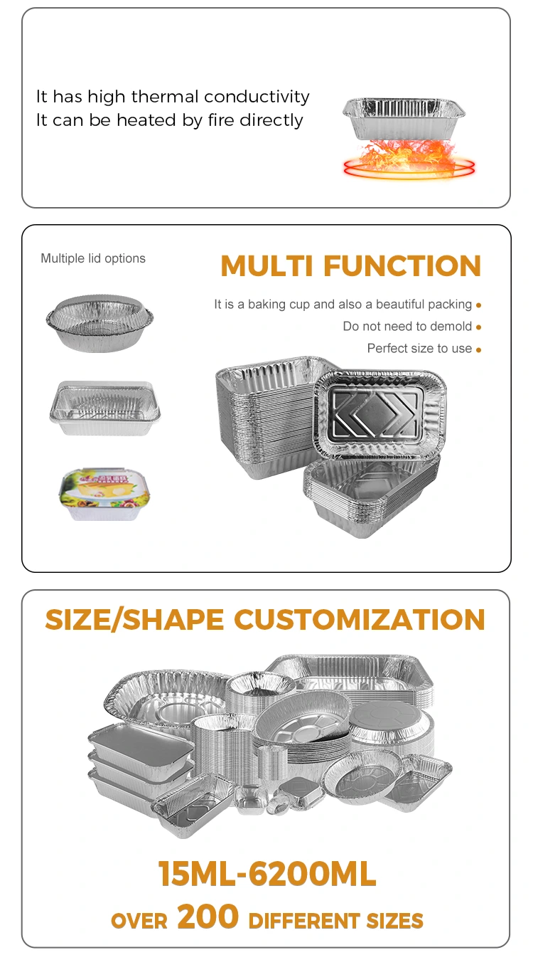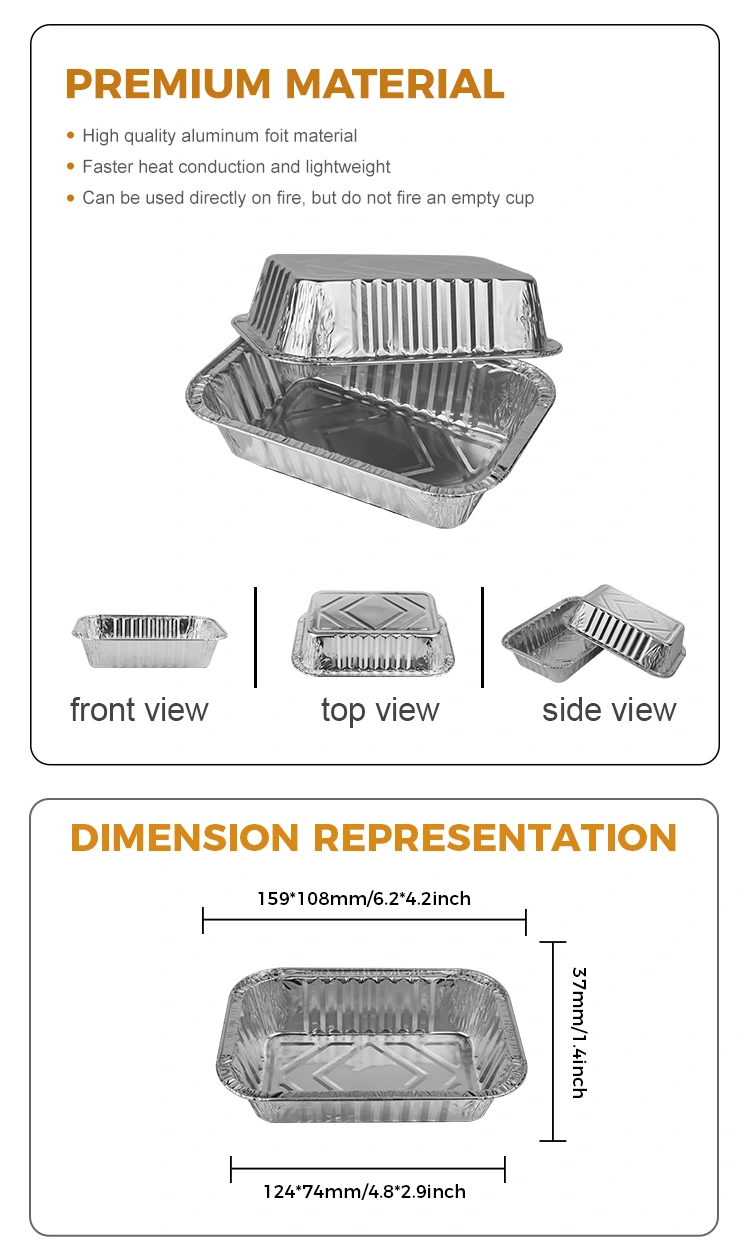 এর ছোট এবং লাইটওয়েট ডিজাইনের কারণে, এই স্কোয়ার কেক বেকিং সিলভার অ্যালুমিনিয়াম ফয়েল কনটেইনার খাবার বহন এবং সংরক্ষণের জন্য উপযুক্ত, স্টোর, ফাস্ট ফুড রেস্তোঁরাগুলিতে খাদ্য স্টোরের ব্যবহার এবং কাস্টমাইজেশনের জন্য উপযুক্ত, ইত্যাদি নীচে অবতল এবং উত্তল টেক্সচার ডিজাইন এমনকি তাপ বিতরণকে নিশ্চিত করে এবং স্থানীয় অতিরিক্ত উত্তাপ এড়ানো এড়াতে পারে। এটি নন-স্লিপ এবং টেকসই, এবং অ্যালুমিনিয়াম ফয়েল বাক্সটি ঘন এবং শক্ত হয়ে যায়, চাপ সহ্য করার ক্ষমতা বাড়িয়ে তোলে এবং এটি পরিবহণের সময়ও স্থিতিশীল থাকে এবং এটি বিকৃত করা সহজ নয়।