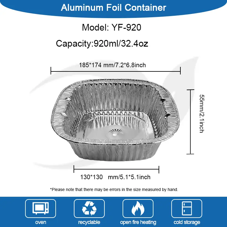 চীন মডেল ওয়াইএফ 920 বর্গাকার সিলভার টেকওয়ে প্যাকিং অ্যালুমিনিয়াম ফয়েল ধারক আকারে খুব বিনয়ী, 185*174 মিমি (7.2*6.8 ইঞ্চি) এর শীর্ষ ব্যাস, 130*130 মিমি (5.1*5.1 ইঞ্চি) এর একটি বেস ব্যাস (5.1*5.1 ইঞ্চি) এর একটি বেস ব্যাস, কেবলমাত্র 55 মিমি (2.1 ইঞ্চি (2.1 ইঞ্চি) এবং এ। এই আকারটি কেবল বহন করা সহজ নয়, তবে বিভিন্ন ব্যবহারের বিভিন্ন প্রয়োজনীয়তাও পূরণ করতে পারে।